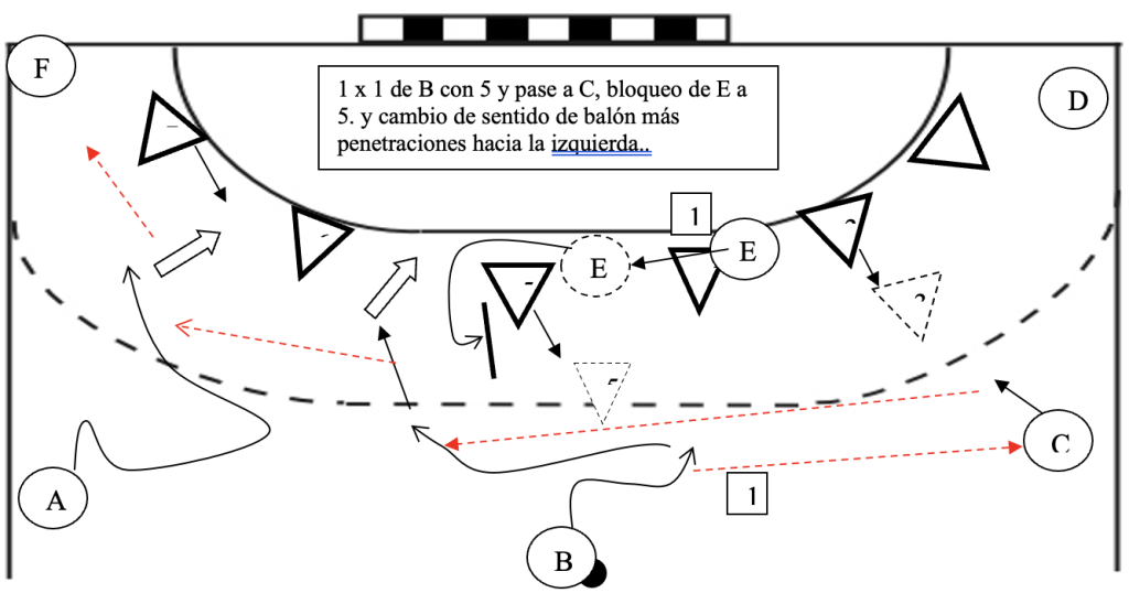 Dominio del 2×2, de A con el bloqueo del pivote a 5, lanzamiento o cambio de dirección de A con trayectoria hacia el exterior entre 6-7, conexión con su extremo F